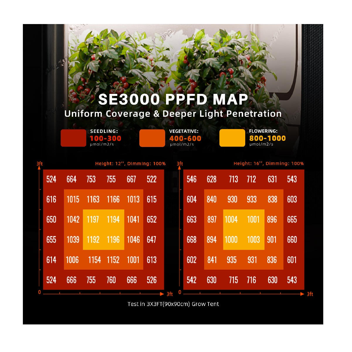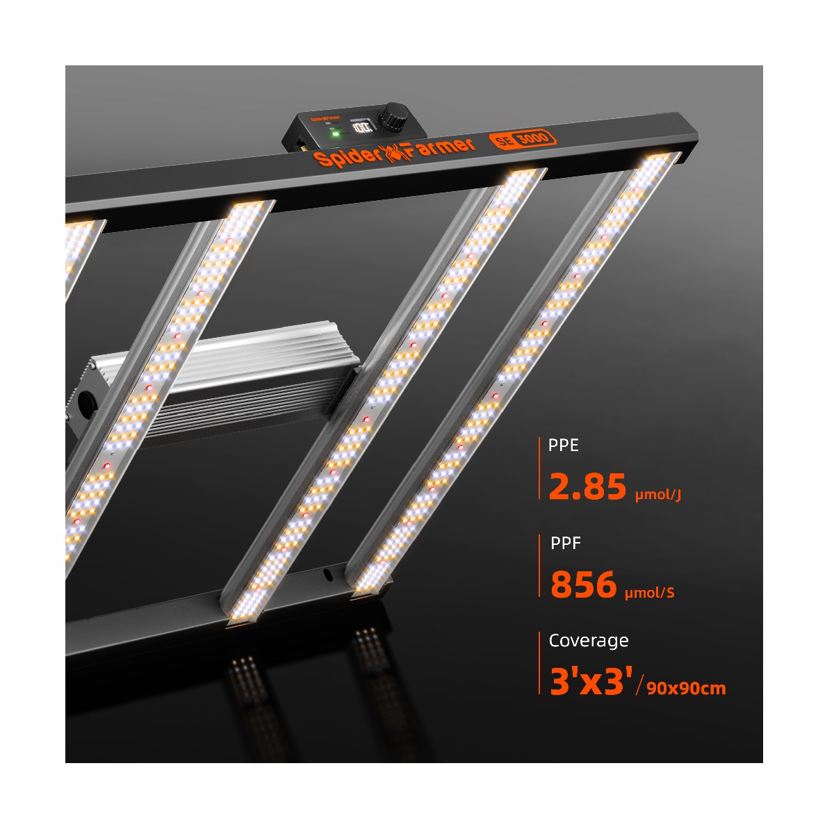 Lampada di ultima generazione SE5000 da 480W con diodi Samsung di ultima generazione LM301H EVO che offre un'elevata emissione luminosa (PPF 1420 µmol) ed efficienza energetica (2,9 µmol/J).