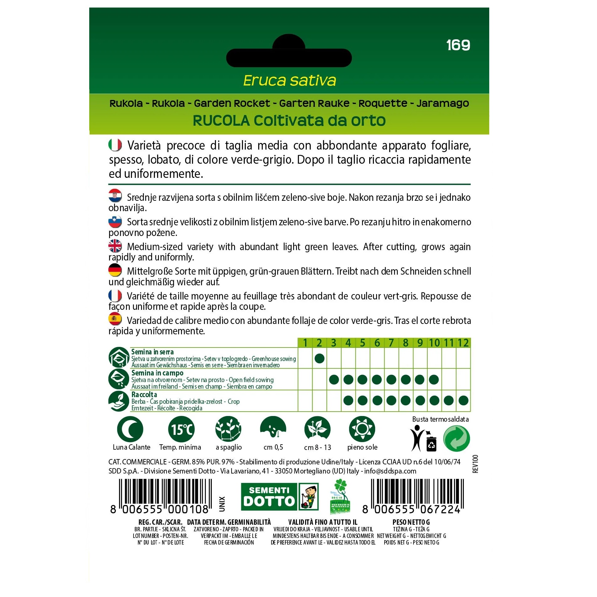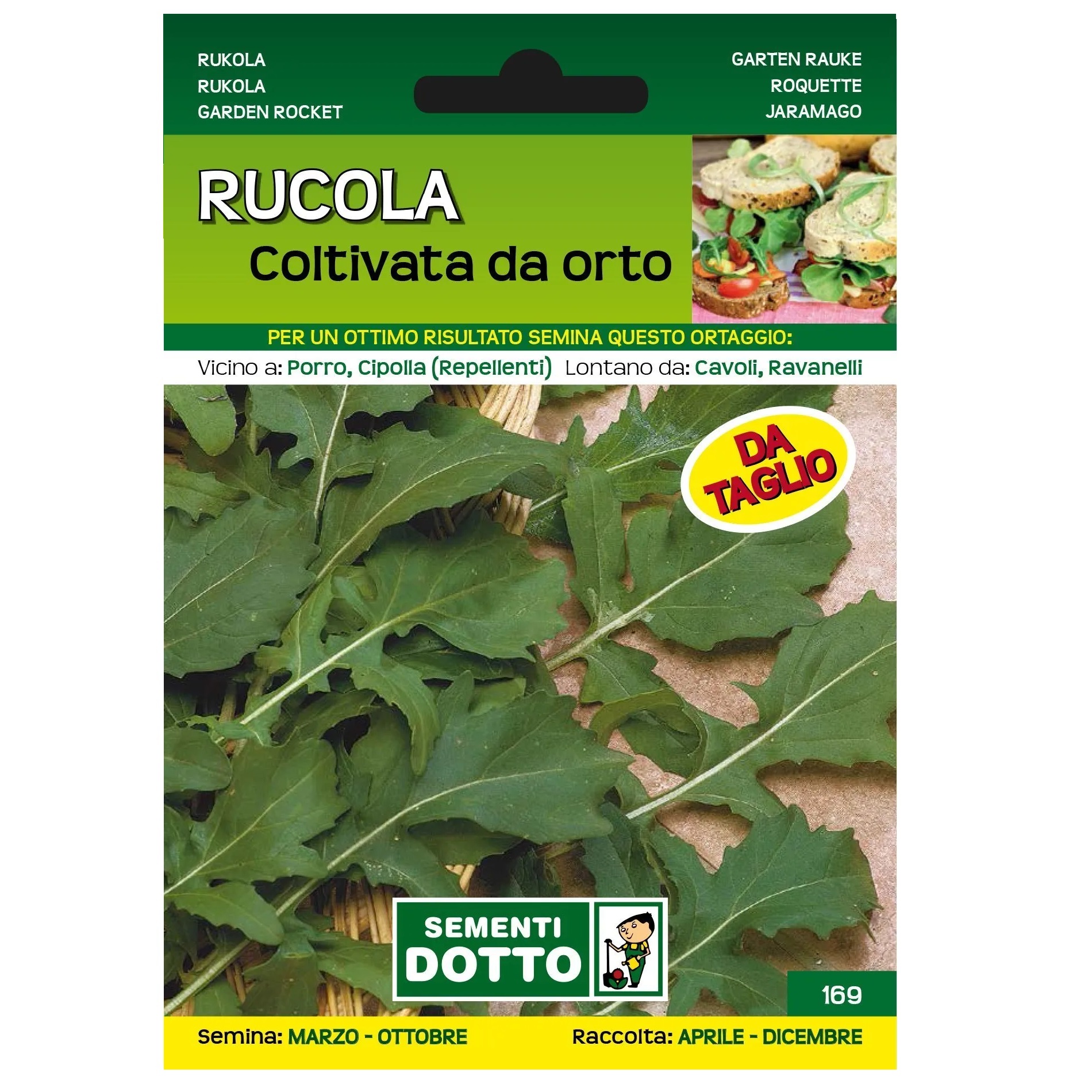 La Rucola Coltivata da Orto è una pianta erbacea della famiglia delle Crucifere, originaria del bacino mediterraneo; altamente aromatica e di sapore pungente, si consuma in insalata.