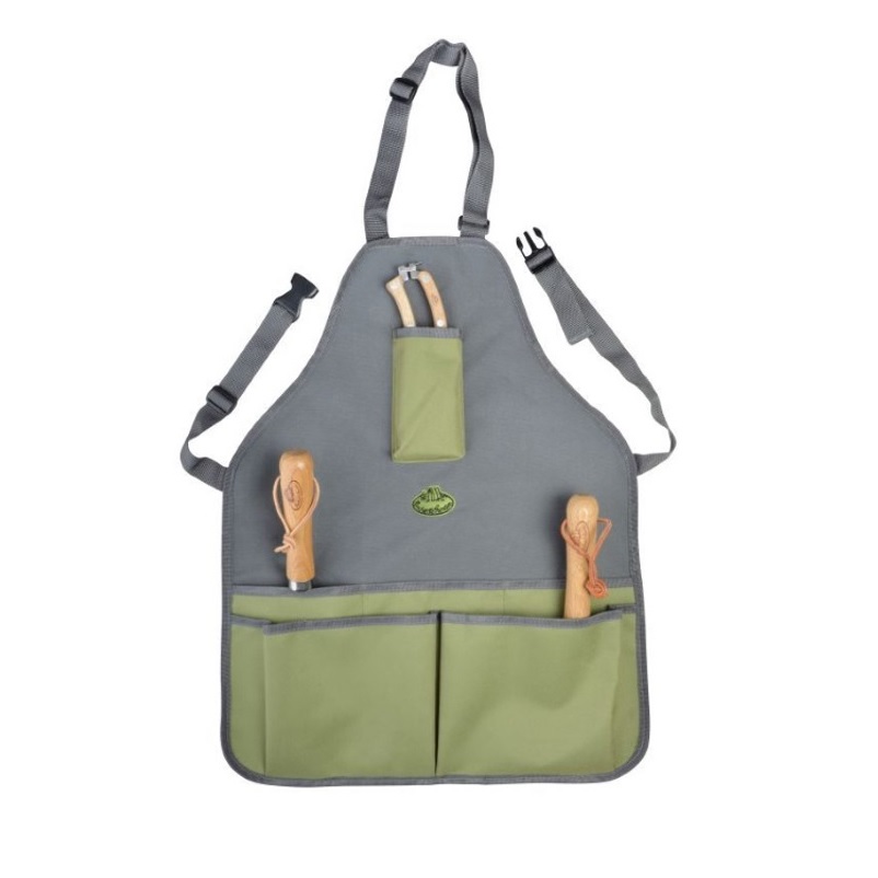 Il grembiule è dotato di tasche per paletta e rastrello.